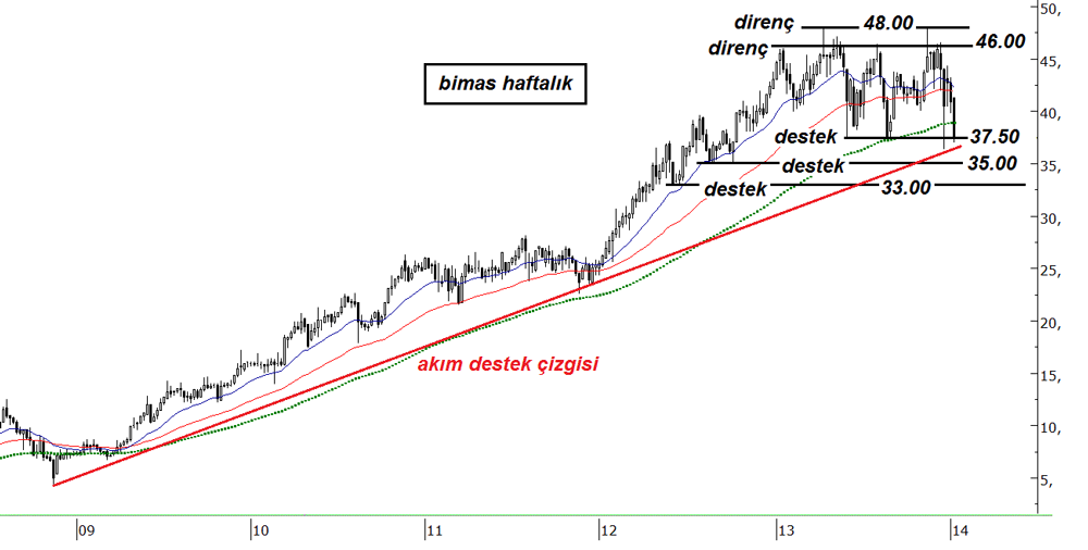 Uzun vadede destek “ 37.50 ” civarında. Son 100 haftalık H.O. desteği e orada. “ 48.00 “ civarında 2 tepe oluştu. Uzun vadeli grafikte görüldüğü kadarıyla “ 46.00 “ da zirvelerin yarattığı direnç var. Son günlerdeki olayların etkisi altında kalmış da olabilir. Sert düşüş gerçekleşmiş ortalamaya doğru. Destekler “ 35.00 ve 33.00 “ de ama akım destek çizgisinin ve uzun vadeli ortalamanın altına inmesi ilk defa gerçekleşmiş olacak ve dikkat gerektirebilir.