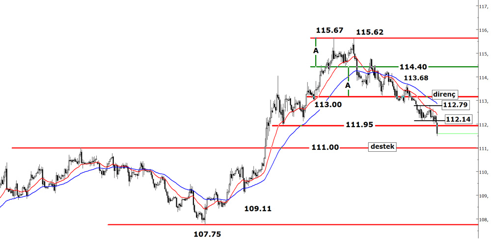Geçtiğimiz günlerde bahsettiğimiz gibi “ 115.67 ve 115.62 “ deki iki zirve oluşumu sonrasında “ 114.40 “ daki dip seviyesinin altına kayınca çok kısa vadeli dönemde “ ikili zirve “ görünümü oluştu. Fiyat “ A “ ile belirlenen kalınlık kadar aşağıya gitti. Asgari hedef olan “ 113.13 “ civarı görüldüğü gibi düşüş daha da devam ederek ( fiyatı hareketli ortalamaların altında bırakarak ) “ 112.00 “ in de altına çekti.