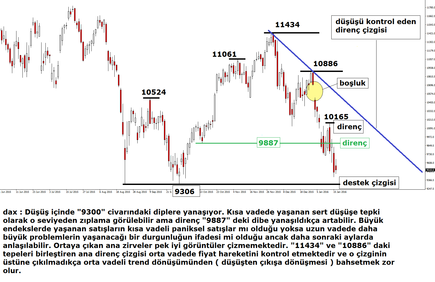 Düşüş içinde “9300″ civarındaki diplere yanaşıyor. Kısa vadede yaşanan sert düşüşe tepki olarak o seviyeden zıplama görülebilir ama direnç “9887″ deki dibe yanaşıldıkça artabilir. Büyük endekslerde yaşanan satışların kısa vadeli paniksel satışlar mı olduğu yoksa uzun vadede daha büyük problemlerin yaşanacağı bir durgunluğun ifadesi mi olduğu ancak daha sonraki aylarda anlaşılabilir. Ortaya çıkan ana zirveler pek iyi görüntüler çizmemektedir. “11434″ ve “10886″ daki tepeleri birleştiren ana direnç çizgisi orta vadede fiyat hareketini kontrol etmektedir ve o çizginin üstüne çıkılmadıkça orta vadeli trend dönüşümünden (düşüşten çıkışa dönüşmesi) bahsetmek zor olur.