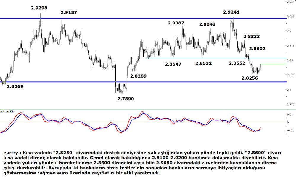 Kısa vadede “2.8250″ civarındaki destek seviyesine yaklaştığından yukarı yönde tepki geldi. “2.8600″ civarı kısa vadeli direnç olarak bakılabilir. Genel olarak bakıldığında 2.8100-2.9200 bandında dolaşmakta diyebiliriz. Kısa vadede yukarı yöndeki hareketlenme 2.8600 direncini aşsa bile 2.9050 civarındaki zirvelerden kaynaklanan direnç çıkışı durdurabilir. Avrupa’ daki bankaların stres testlerinin sonuçları bankaların sermaye ihtiyaçları olduğunu göstermesine rağmen “euro” üzerinde zayıflatıcı bir etki yaratmadı.