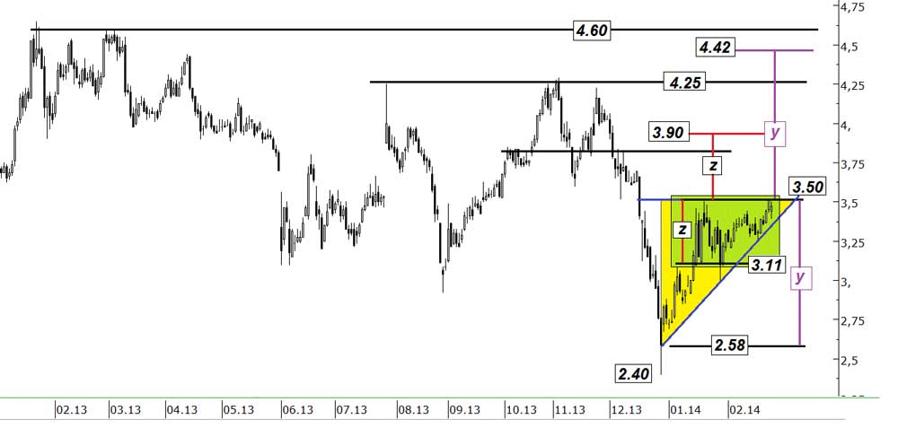 Yeşil renkle gösterilen yatay alan yukarı katlandığında asgari teknik hedef 3.90 civarı olurken sarı renkle gösterilen üçgenin yukarı katlanması durumunda ise teknik hedef 4.40 civarı olabilir ama borsanın da yükselişe geçmesi gerekebilir bunun yaşanabilmesi için.
