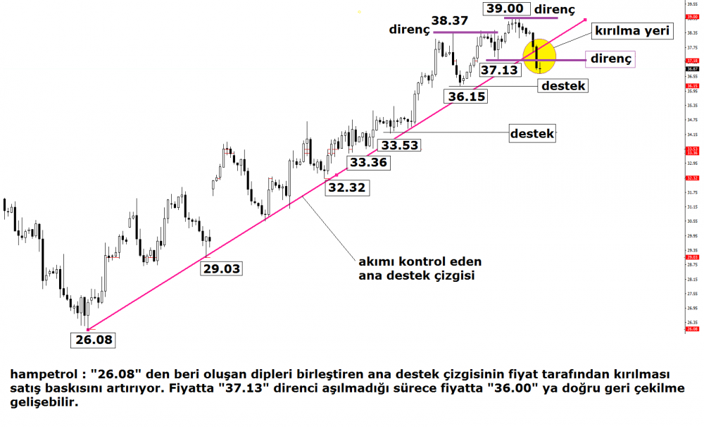 “26.08″ den beri oluşan dipleri birleştiren ana destek çizgisinin fiyat tarafından kırılması satış baskısını artırıyor. Fiyatta “37.13″ direnci aşılmadığı sürece fiyatta “36.00″ ya doğru geri çekilme gelişebilir.
