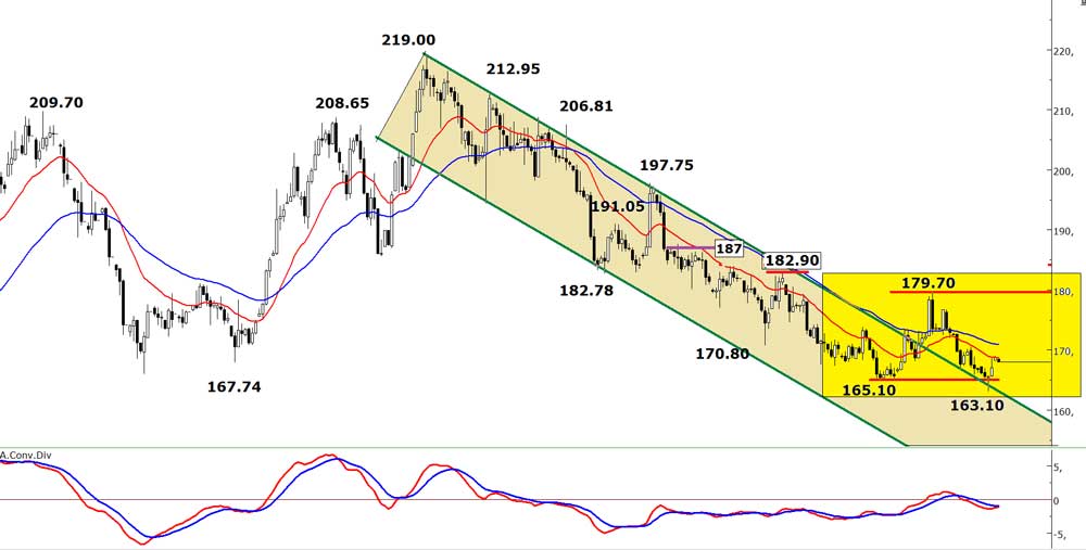 “ 165.10 “ den başlayan çıkış “179.70” e kadar sürdü. “ 182.90 “ daki direnç devreye girerek çıkışın önünü kesti denilebilir. Yeşil çizgilerle belirlenen düşüş kanalının dışına çıkan fiyatta “ 179.00 “ civarından gelen satışlarla “ 170.00 “ in altına inildi ve fiyat bu düşüşte elde edilen en düşük seviyeye gelerek “ 163.10” u gördü. Satış baskısı olduğu görülüyor. Günlük grafiklerde macd’ de oluşan pozitif uyumsuzluk bu yaşanan düşüşün pek devam etmeyeceği şeklinde mesajlar verdiğinden dolayı kısa vadede bir şeyler yaşanabilir mi diye ürünü ve grafiğini takibe almakta yarar olabilir. Sarı renkle gösterilen alan içinde “ 165.00 “ in altına inmeden bir dip daha yapılıp “ 170.00” in üstüne çıkıldığında görüntü TOBO tabanı görüntüsüne de dönüşebilir. Garantisi yok tabii. “ 180.00 “ geçildiği taktirde de fiyatta “ 182.90 “ veya daha yukarıya doğru hareketlenme beklenebilir. Sağ tarafta “ 170.00 in üstüne gidildikten sonra artık “170.00 ” in altında bir yerlere ( sizin kaybı kabullenme seviyesine diyelim ) stop konularak yukarı hamlede “ 182.90 ” ı aşıp aşmayacağı izlenebilir. Aşması durumunda fiyat 185.00’ i de zorlayabilir.