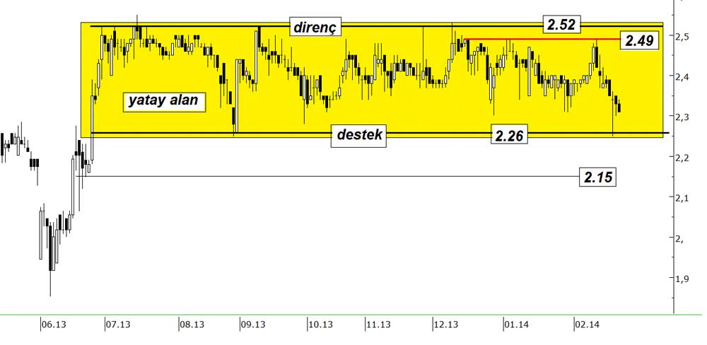 Destek çok kısa vadede “ 2.26 ” da. Altında “ 2.15 ve 2.05 “ destekleri var. “ 2.52 “ direnci güçlü gözüküyor bu etapta ve oraya yaklaşıldığında direnç sertleşebilir. Kaç seferdir o seviyeden geri dönmüş.