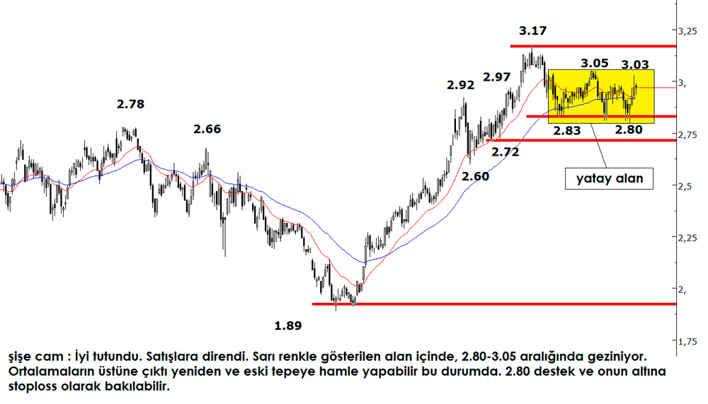 Sarı renkle gösterilen alan içinde, 2.80-3.05 aralığında geziniyor. Ortalamaların üstüne çıktı yeniden ve eski tepeye hamle yapabilir bu durumda. 2.80 destek ve onun altına stoploss olarak bakılabilir.