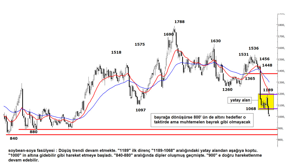 Düşüş trendi devam etmekte. “1189″ ilk direnç “1189-1068″ aralığındaki yatay alandan aşağıya koptu. “1000″ in altına gidebilir gibi hareket etmeye başladı. “840-880″ aralığında dipler oluşmuş geçmişte. “900″ e doğru hareketlenme devam edebilir.